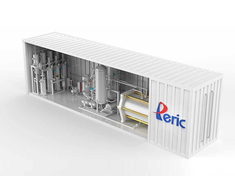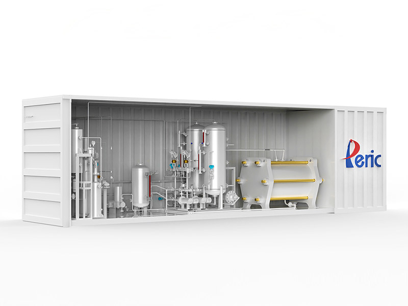 Containerized-type H2 generator is completely developed and designed by PERIC, called as model KCDQ series. All the main elements of these model series have been integrated within 40-feet container, such as electrolyzer, gas-lye treater, hydrogen purification unit, water tank, power rectification unit, PLC control system and PDB/MCC, etc. H2 flow of such H2 generator ranges from 5Nm³/h to 100Nm³/h, and all interconnection within the container has been completed before shipment. Customers can just plug the utilities to their plant and then start it. It extremely saves the capital cost of customer to set up. H2 purity could be better than 99.999% and dew point better than -70 Deg.C.